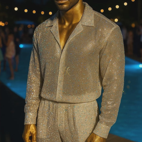 SEO Keywords: birthday outfit men, luxury gay fashion, sequin lace shirt and pants, French handmade outfit, party look for men, limited edition, Kayib Men.