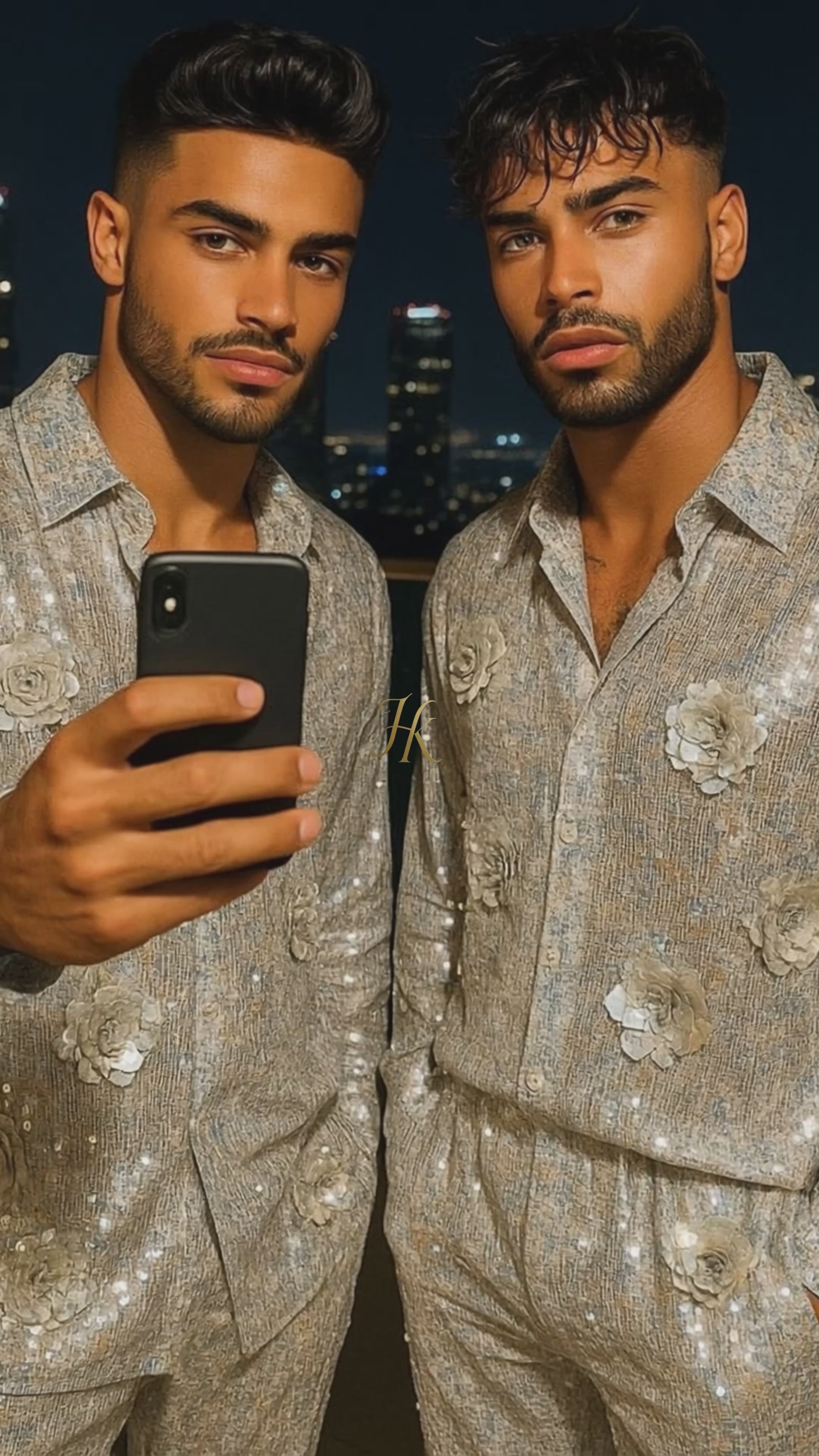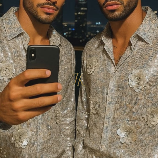 SEO Keywords: luxury gay outfits, handmade sequin outfit, men’s dinner fashion, limited edition couture, gay men fashion, French lace fabric, Kayib Men.